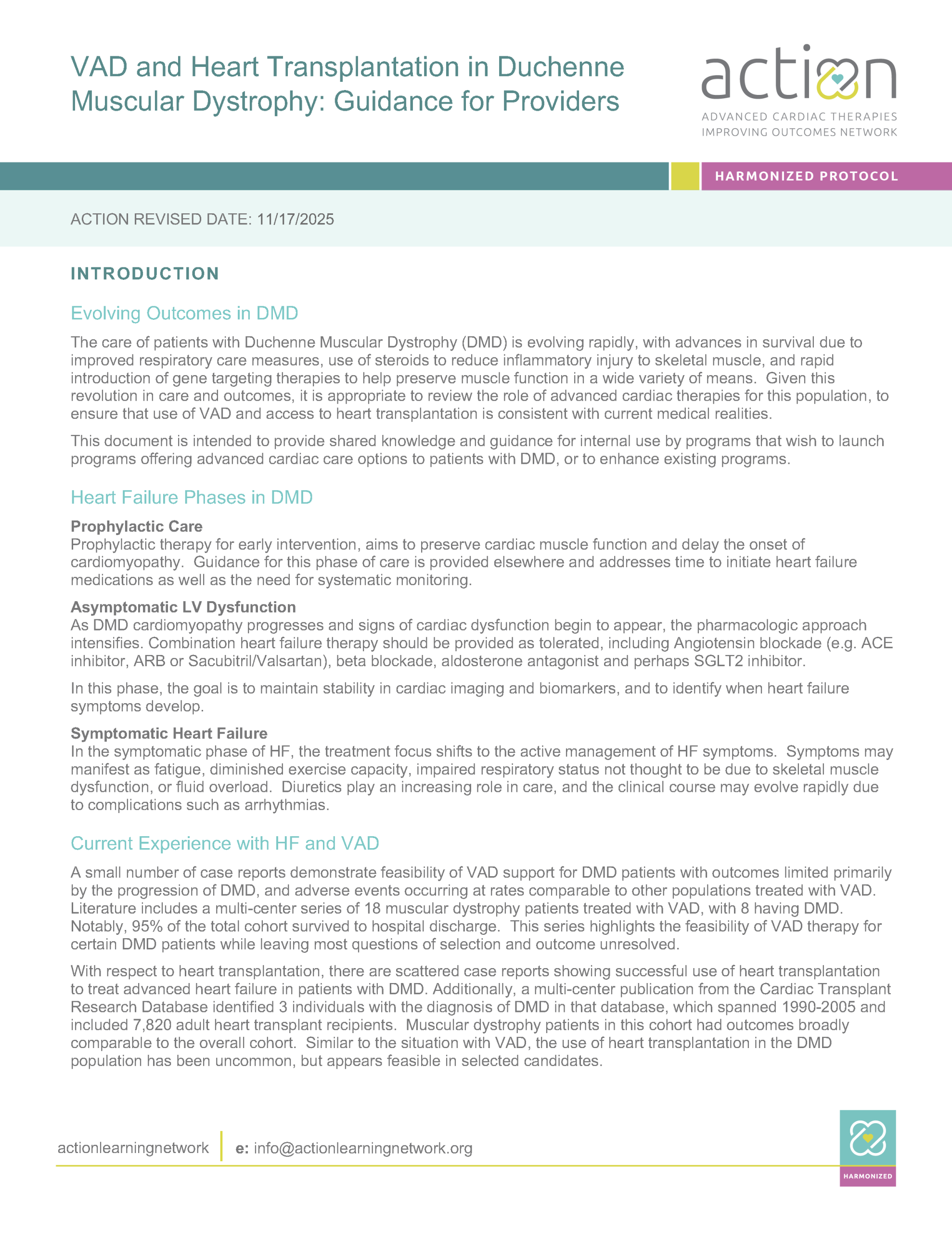 Harmonized Protocol: VAD and Heart Transplantation in DMD Guidance for ProvidersBy ACTION / January 7, 2026 Harmonized Protocol: VAD and Heart Transplantation in DMD Guidance for Providers Click the image below to download.